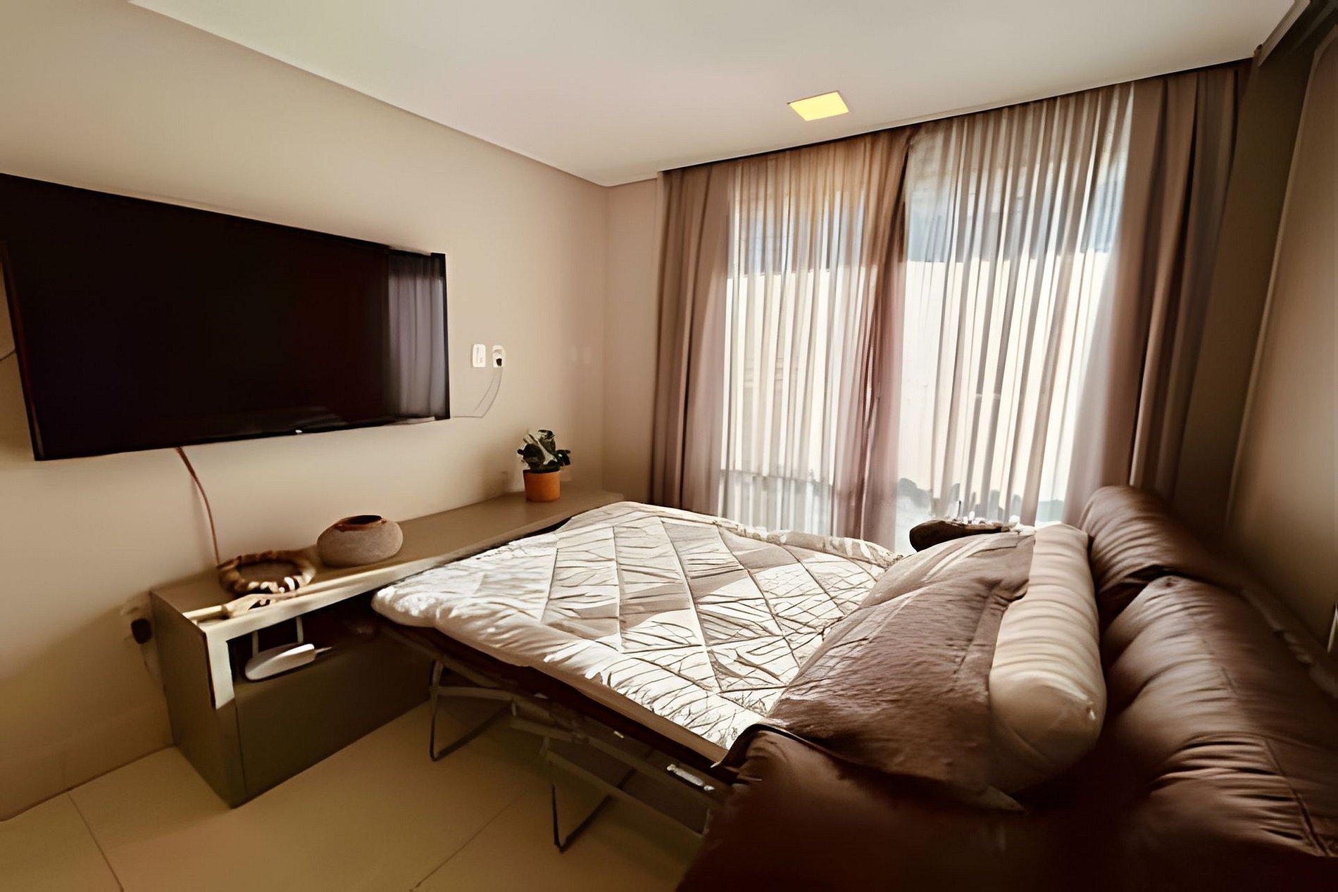 O apartamento é em estilo loft, aberto, mas que tem a opção de fechamento separando o quarto da sala, bastante útil quando hospedando mais de duas pessoas. Possui sala de estar com sofá cama, puffs, smart tv e ar condicionado, mesa com quatro cadeiras, cozinha completa com talheres, potes e panelas. Quarto com cama tamanho queen e banheiro anexo amplo.