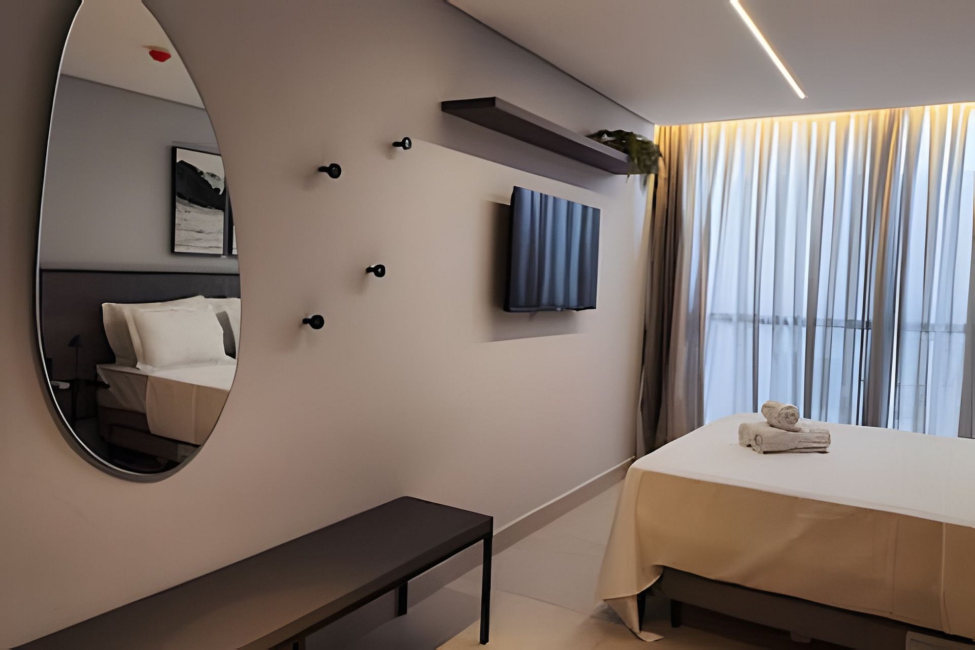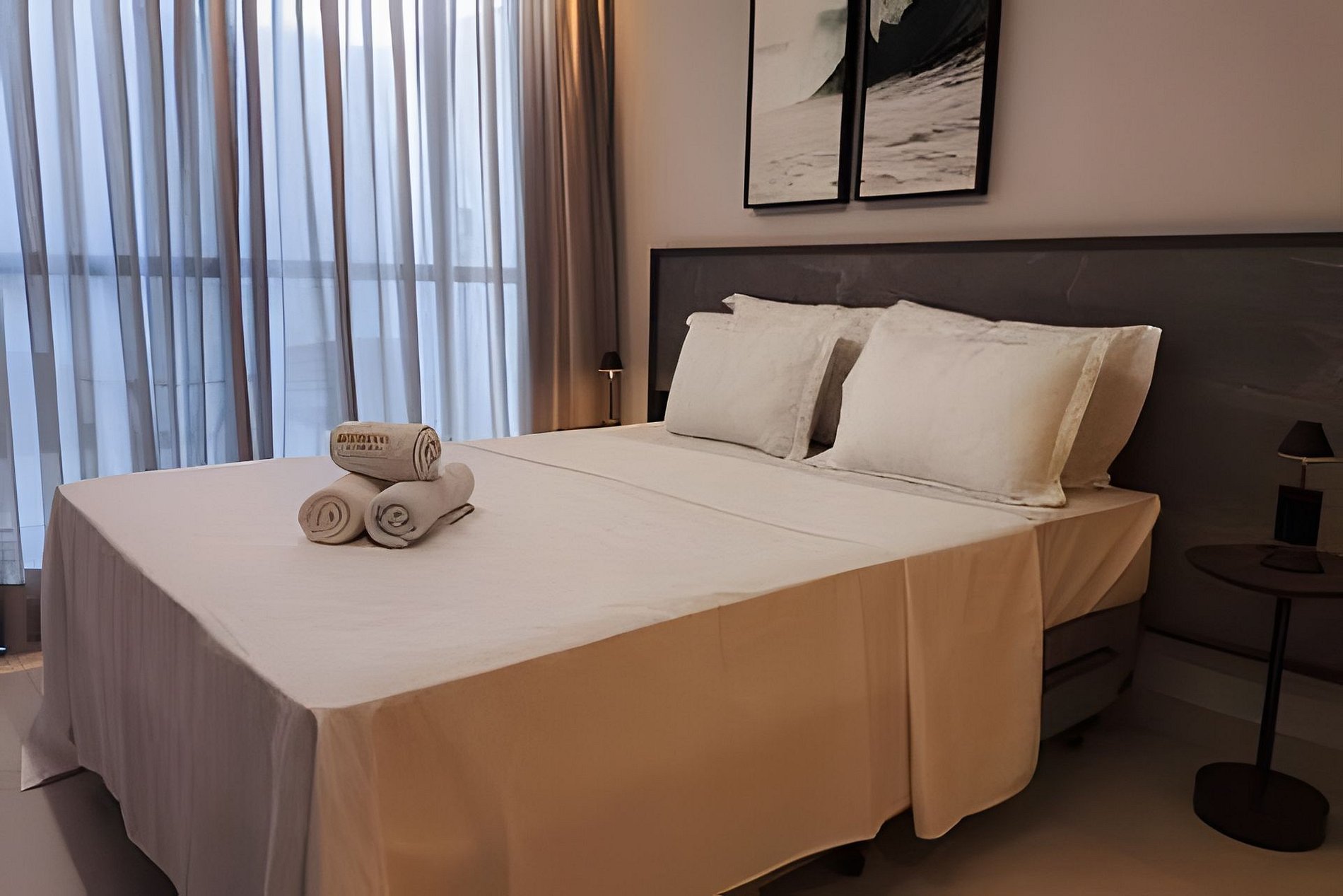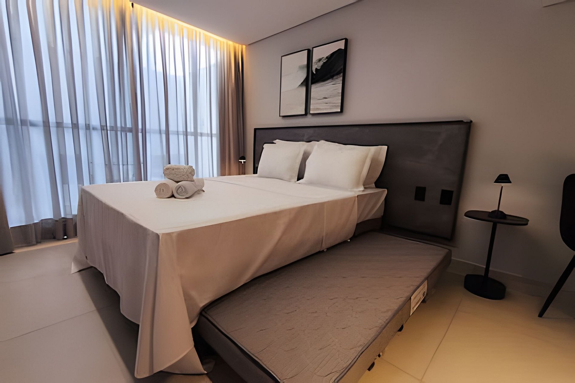 O apartamento possui uma cama de casal confortável e duas camas auxiliares de solteiro, uma smarTV com acesso a Youtube e Netflix, com ar condicionado, há um cabideiro e ferro elétrico. Banheiro com chuveiro elétrico e duchinha higiênica. A cozinha do apartamento é completa e compacta com todos os utensílios e eletrodomésticos para sua comodidade.