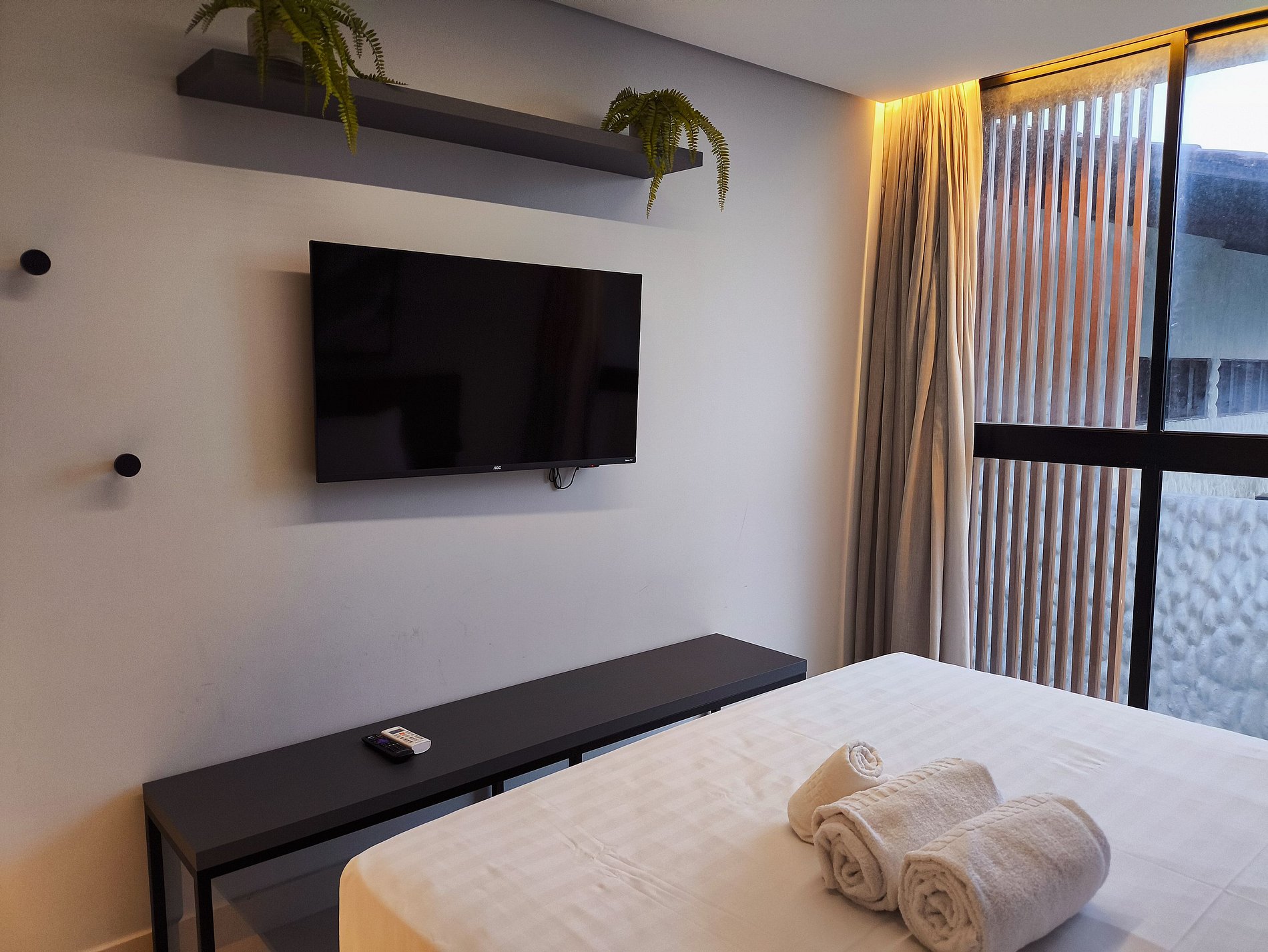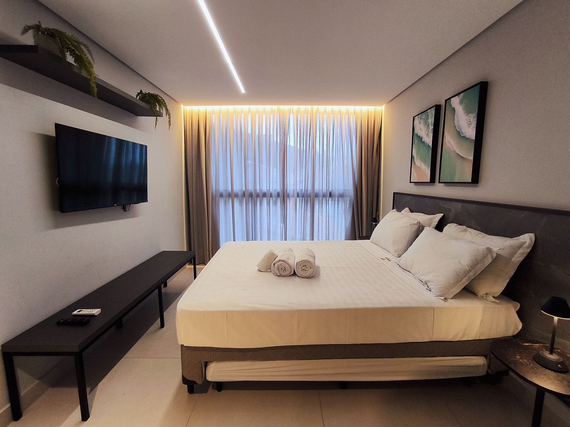 O apartamento possui uma cama de casal confortável e duas camas auxiliares de solteiro, uma smarTV com acesso a Youtube e Netflix, com ar condicionado. Banheiro com chuveiro elétrico e duchinha higiênica. A cozinha do apartamento é completa e compacta com todos os utensílios e eletrodomésticos para sua comodidade, sem contar a linda vista do mar.