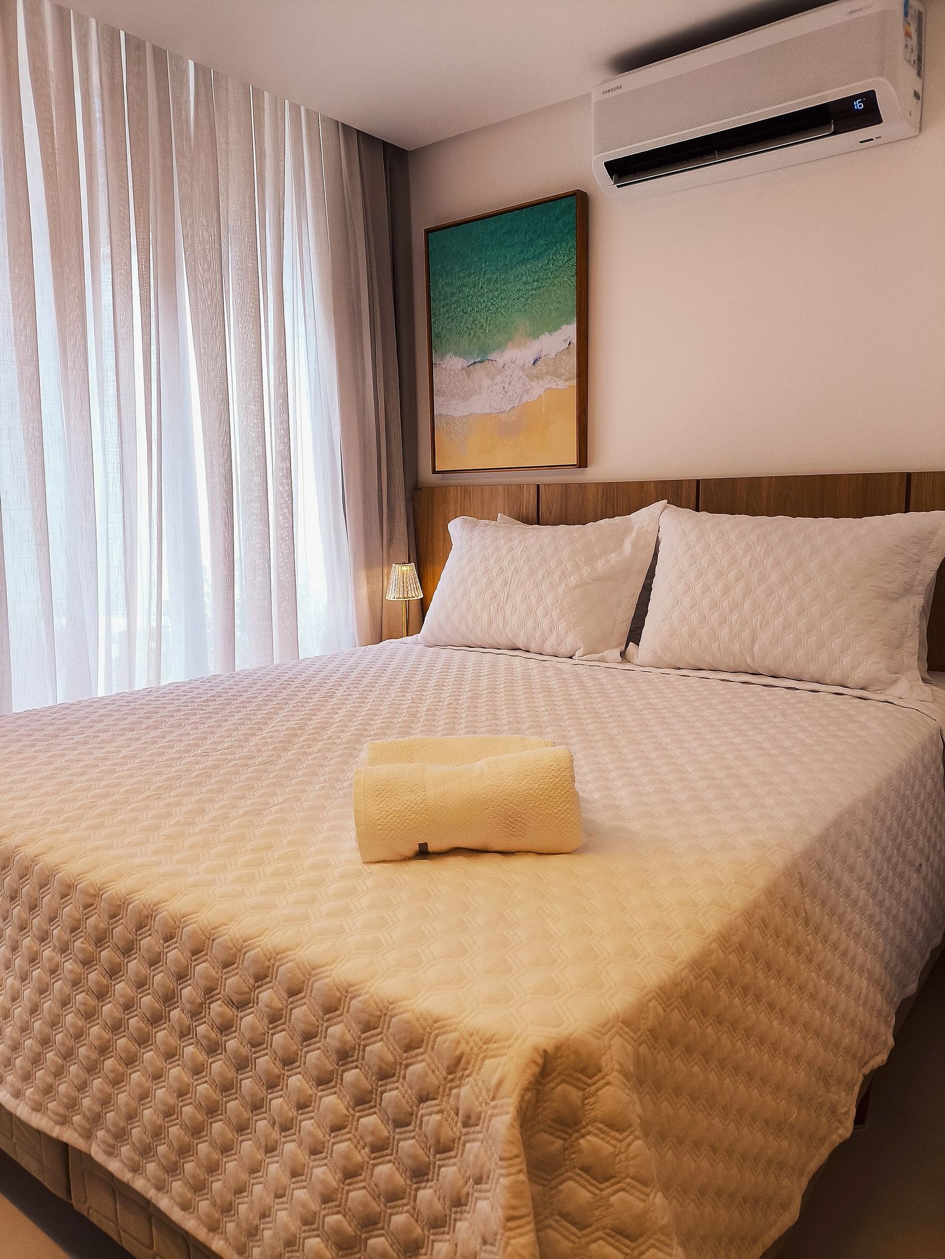 O apartamento possui uma cama de casal confortável, uma smarTV com acesso a Youtube e Netflix, com ar condicionado, há um cabideiro e ferro elétrico. Banheiro com chuveiro elétrico e duchinha higiênica. A cozinha do apartamento é completa e compacta com todos os utensílios e eletrodomésticos para sua comodidade.
