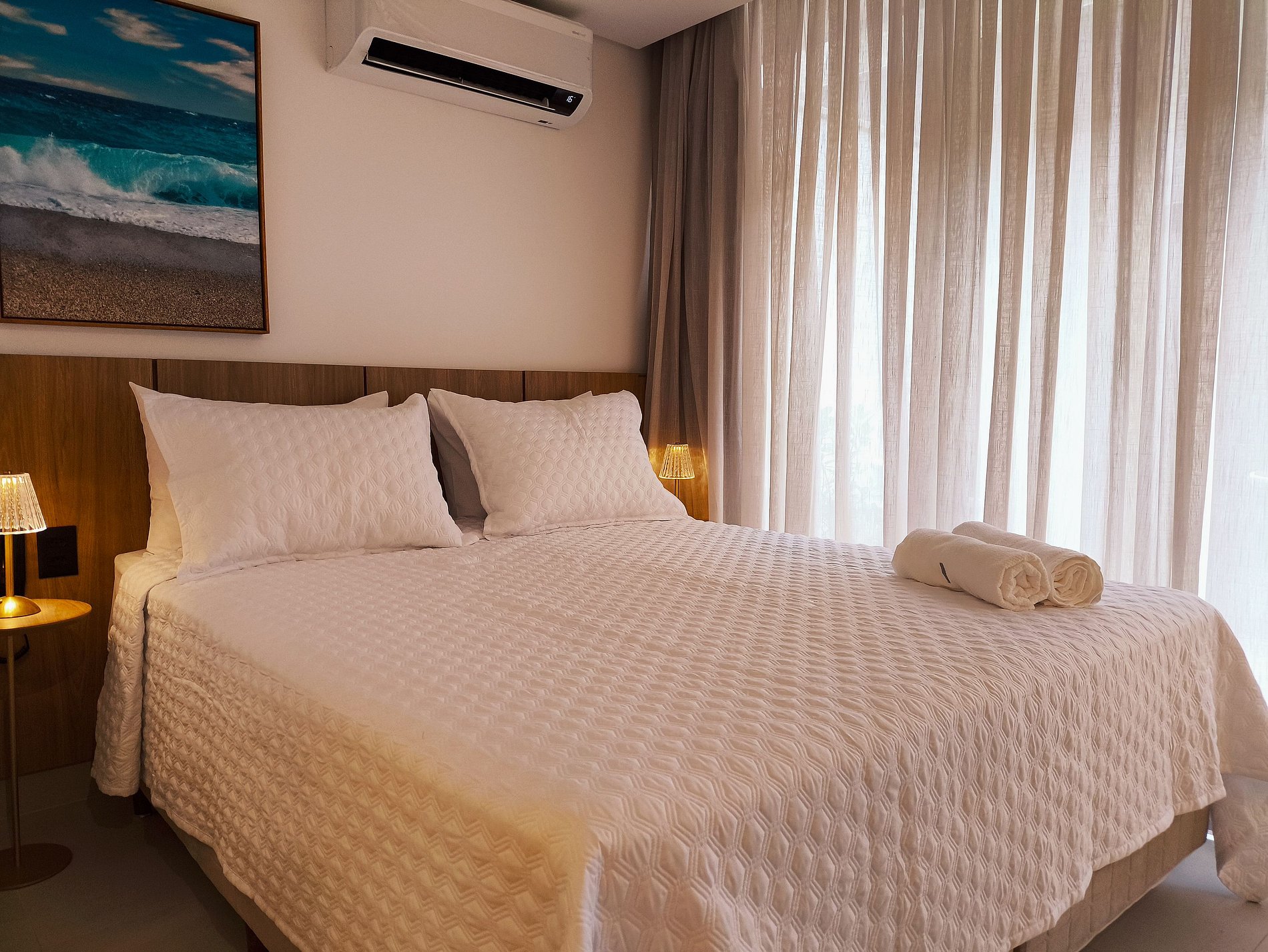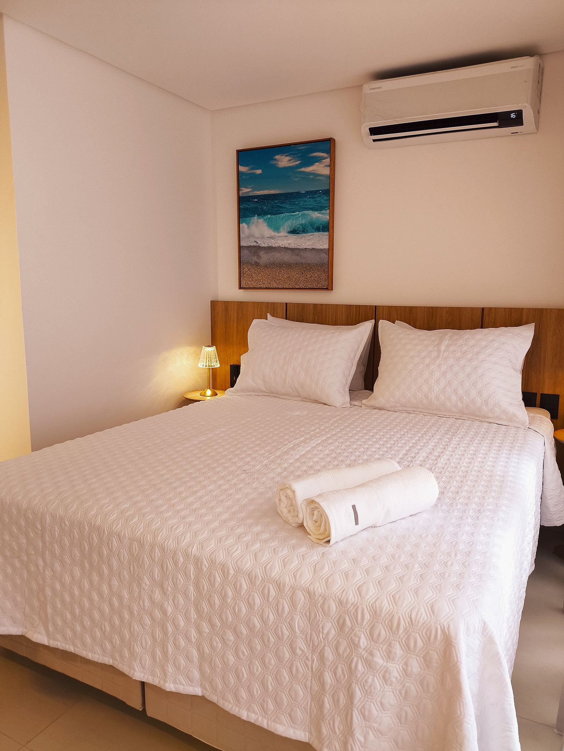 O apartamento possui uma cama de casal confortável, uma smarTV com acesso a Youtube e Netflix, com ar condicionado, há um cabideiro e ferro elétrico. Banheiro com chuveiro elétrico e duchinha higiênica. A cozinha do apartamento é completa e compacta com todos os utensílios e eletrodomésticos para sua comodidade.