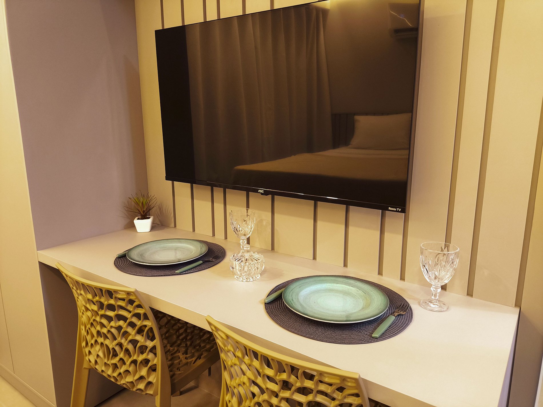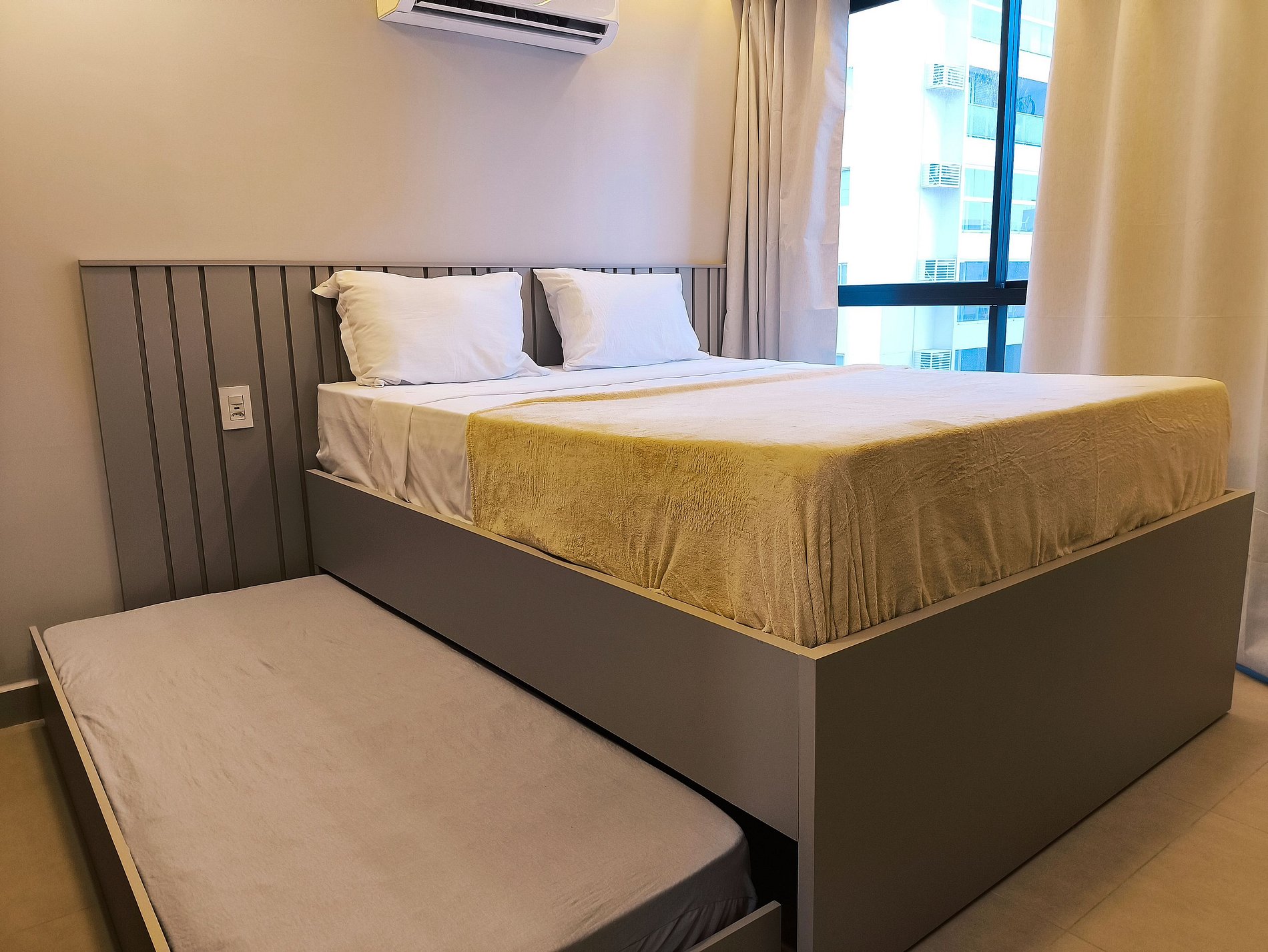 O apartamento possui duas camas de casal confortáveis, uma smarTV com acesso a Youtube e Netflix, com ar condicionado e vista para a cidade, há um cabideiro e ferro elétrico. Banheiro com chuveiro elétrico e duchinha higiênica. A cozinha do apartamento é completa e compacta com todos os utensílios e eletrodomésticos para sua comodidade.