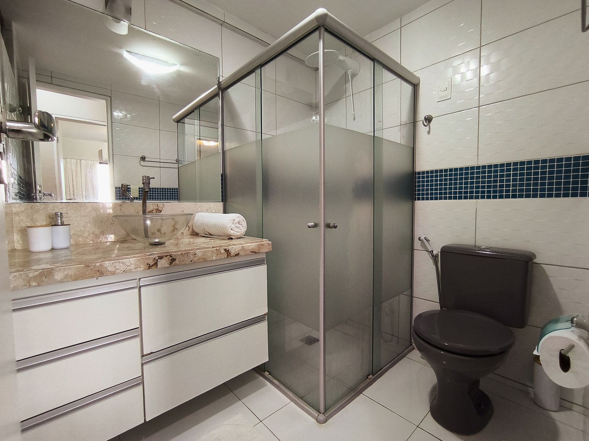 O apartamento possui uma sala de estar com cortina, sofá-cama para duas pessoas, além de uma smart tv. Na sala de jantar há uma grande mesa com 6 cadeiras. A cozinha do ap é completa, possuindo geladeira, fogão, micro-ondas, liquidificador, sanduicheira, cafeteira elétrica, panelas, talheres e outros utensílios domésticos. Há uma área de serviço com maquina de lavar, além de varal. O quarto principal é uma suíte, possui uma cama de casal, um guarda-roupas e ar-condicionado. O segundo quarto, possui uma cama de casal com uma cama auxiliar de solteiro, guarda-roupas e ar-condicionado. Já o último quarto, possui duas camas de solteiro, uma das camas possui uma cama auxiliar de solteiro e ar-condicionado. Em todos os banheiros há chuveiro elétrico.